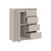 Комбинированное наполнение позволяет распределить вещи по категориям. Ящики выдвигаются на полную глубину, обеспечивая быстрый доступ к содержимому. Отделение с распашной дверцей разместит коробки, книги и другие объемные предметы. Рельефный фасад с волнообразной фрезеровкой создает стильный и динамичный образ модели.